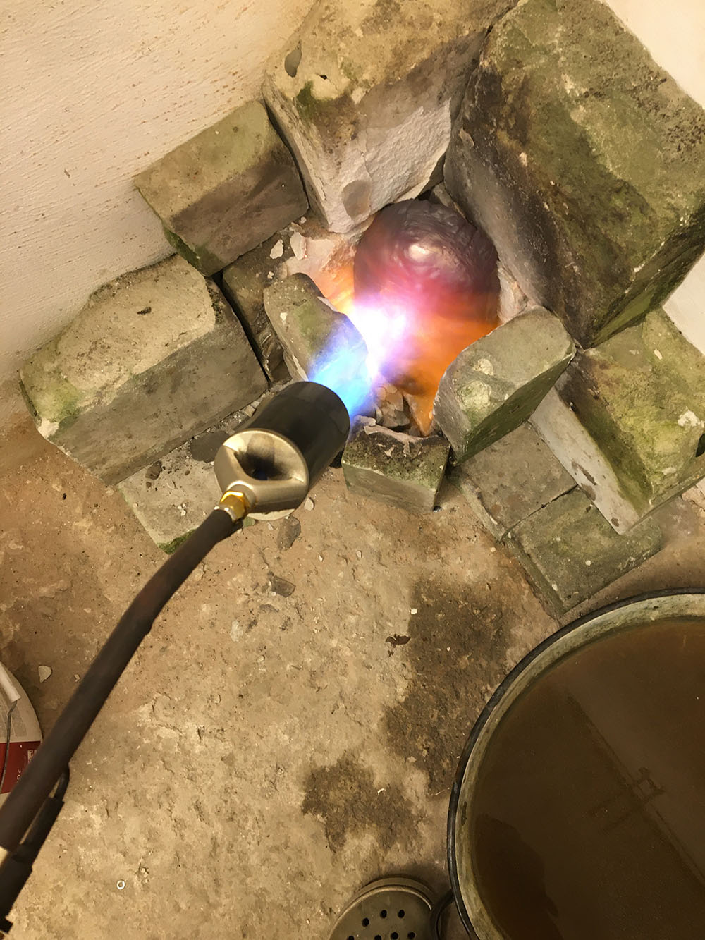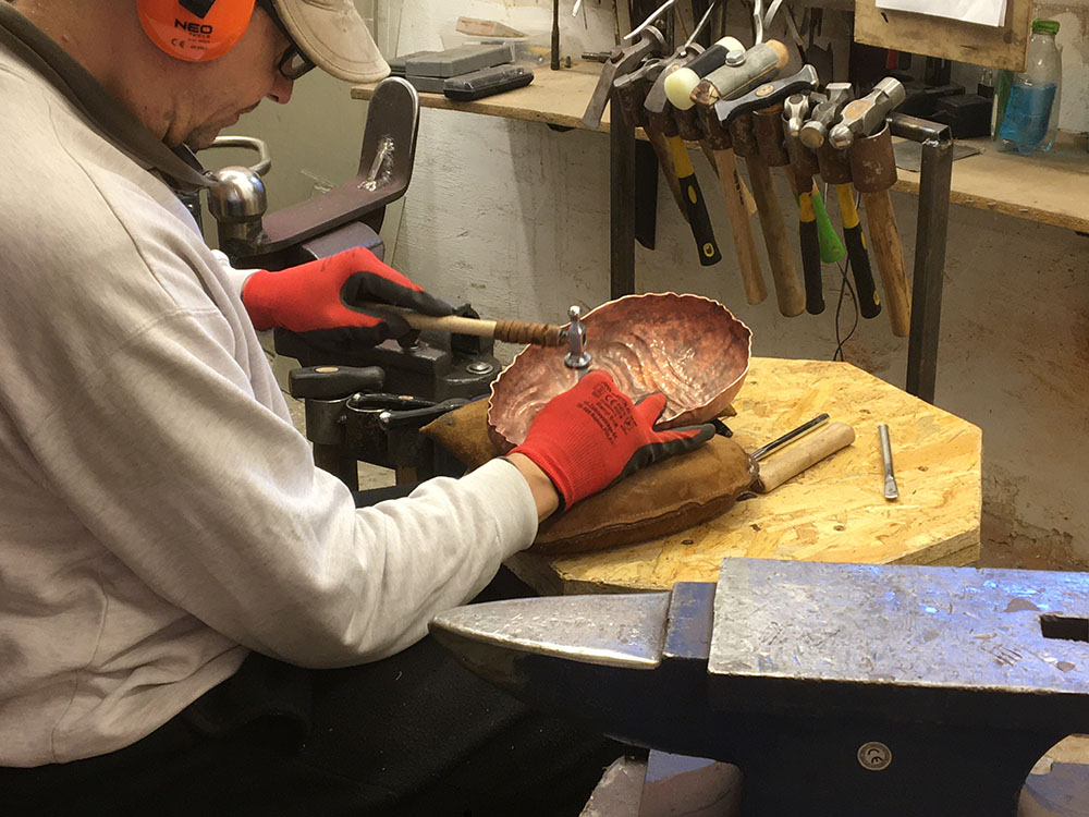 Pokazuję proces wygrzewania blachy, na skutek którego staje się ona bardziej plastyczna i podatna na formowanie metodą wyciągania i repusowania.