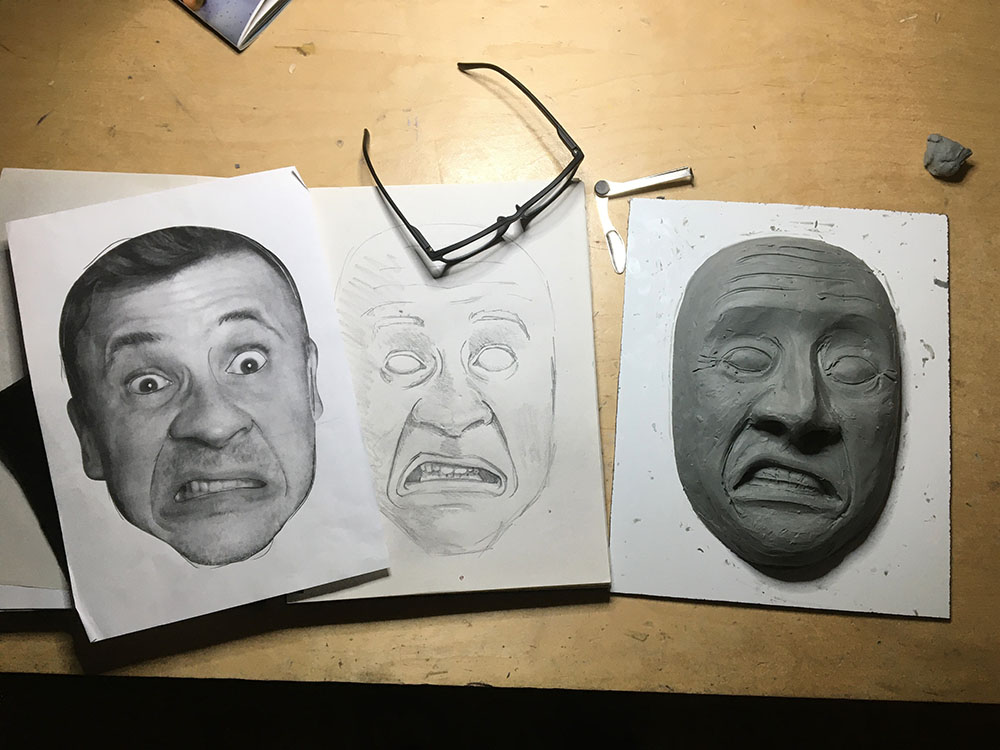 Najpierw fotografuję twarz – wywołuję na niej grymas, potem szkicuję. Aby poznać dokładnie przestrzenną anatomię twarzy, robiłem wcześniej modele w plastelinie.