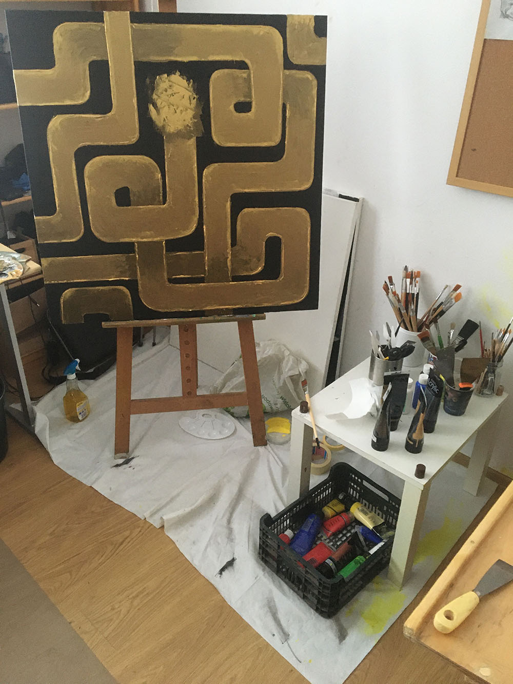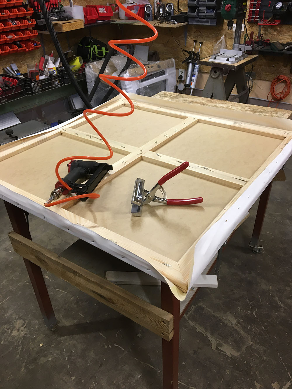 Aby zamontować maski na obrazie, muszę przygotować odpowiednie krosna, Pod płótnem umieszczam płytę MDF o grubości 5mm, do której mogę przykręcić maskę.